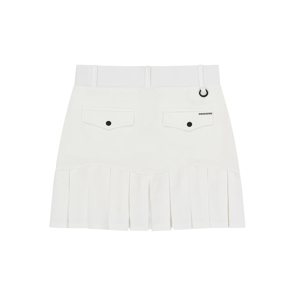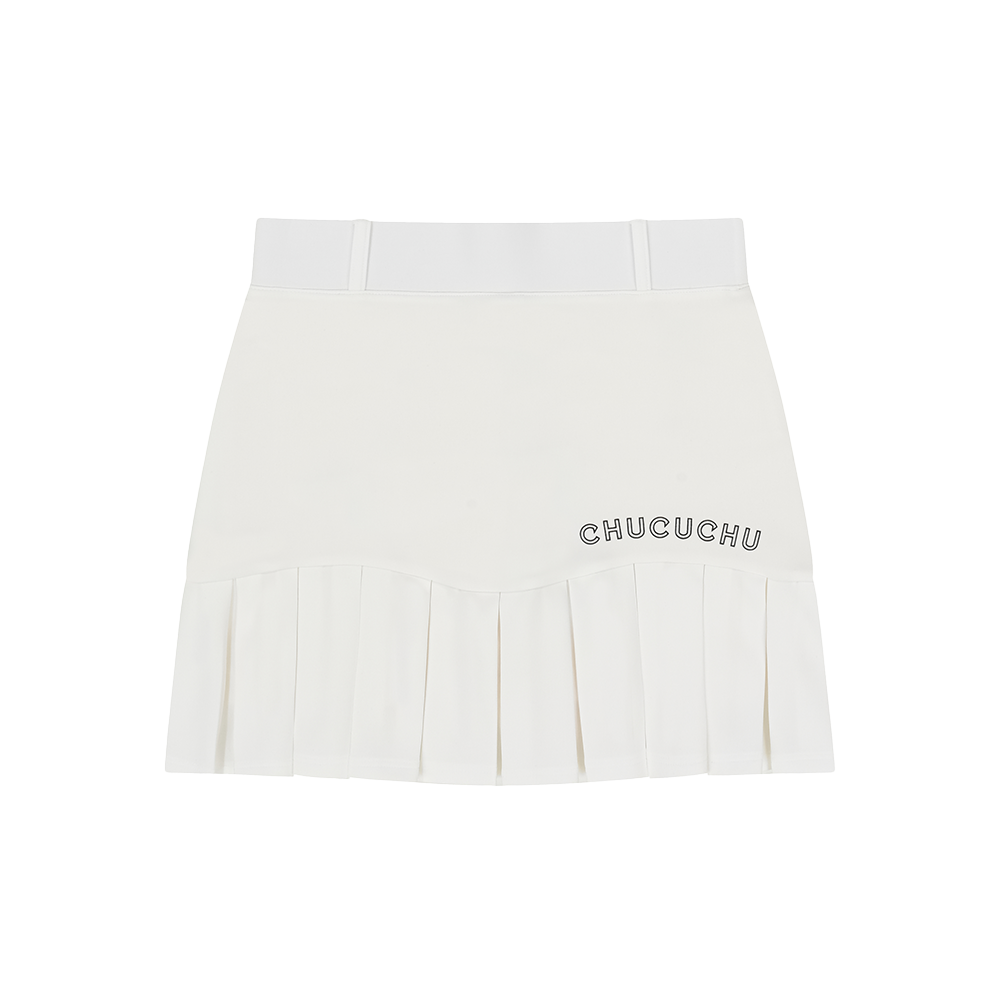 Pleat detailing flows naturally below the hip line, giving the skirt a sharp, structured look. The stretch fabric ensures a comfortable fit while enhancing mobility. Additional details include a printed logo point above the pleats, a back pocket that adds shape and function, and an elastic waistband with built-in undershorts for secure, all-day wear.
