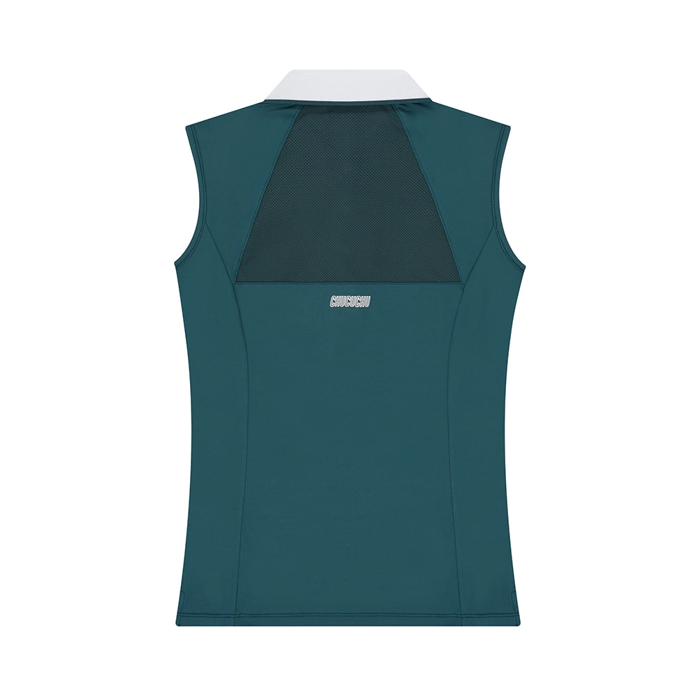 A sleeveless top with a sharp collar design, breathable comfort, and versatile pairing potential.