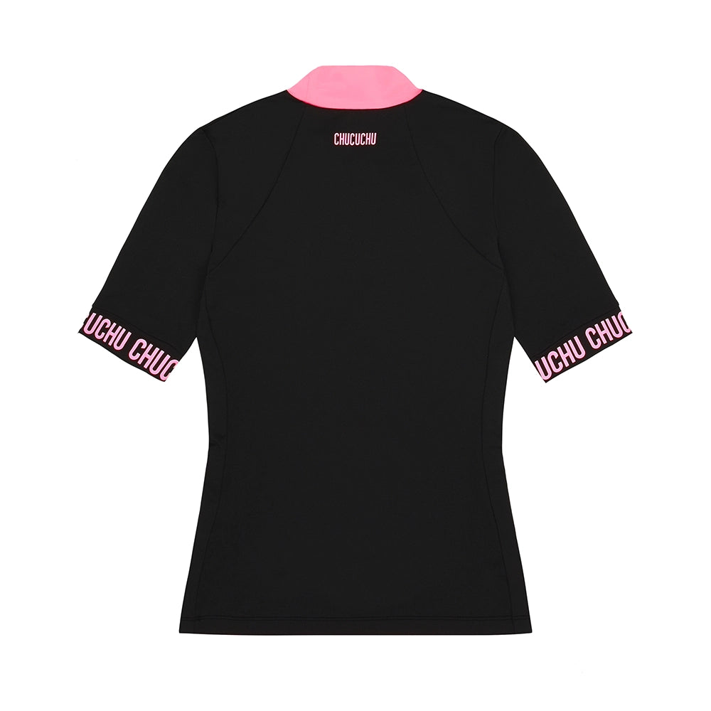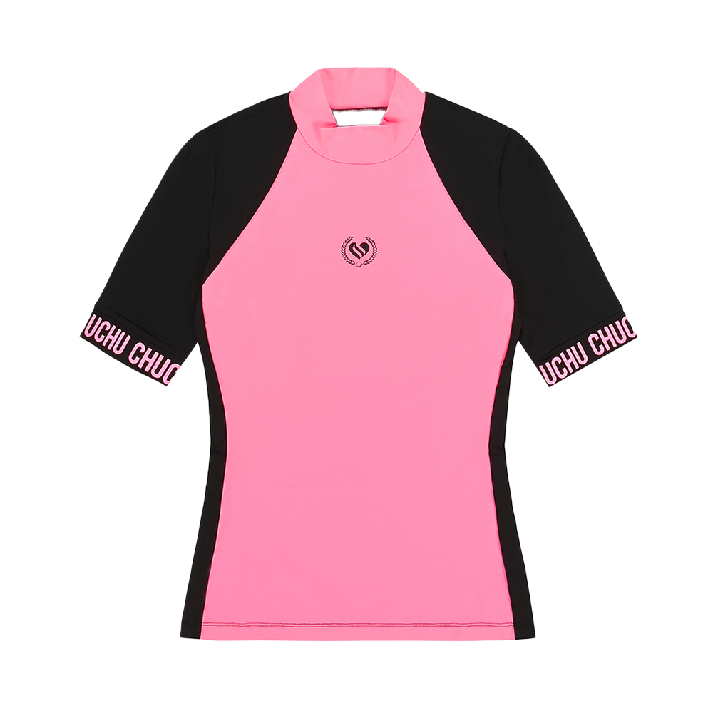 The Shoulder Point Half-Neck Top combines a clean half-neck silhouette with bold shoulder accents for a sporty, modern edge. Contrasting color blocking runs from the armhole to the hem in black tones, creating a sleek, slimming effect.